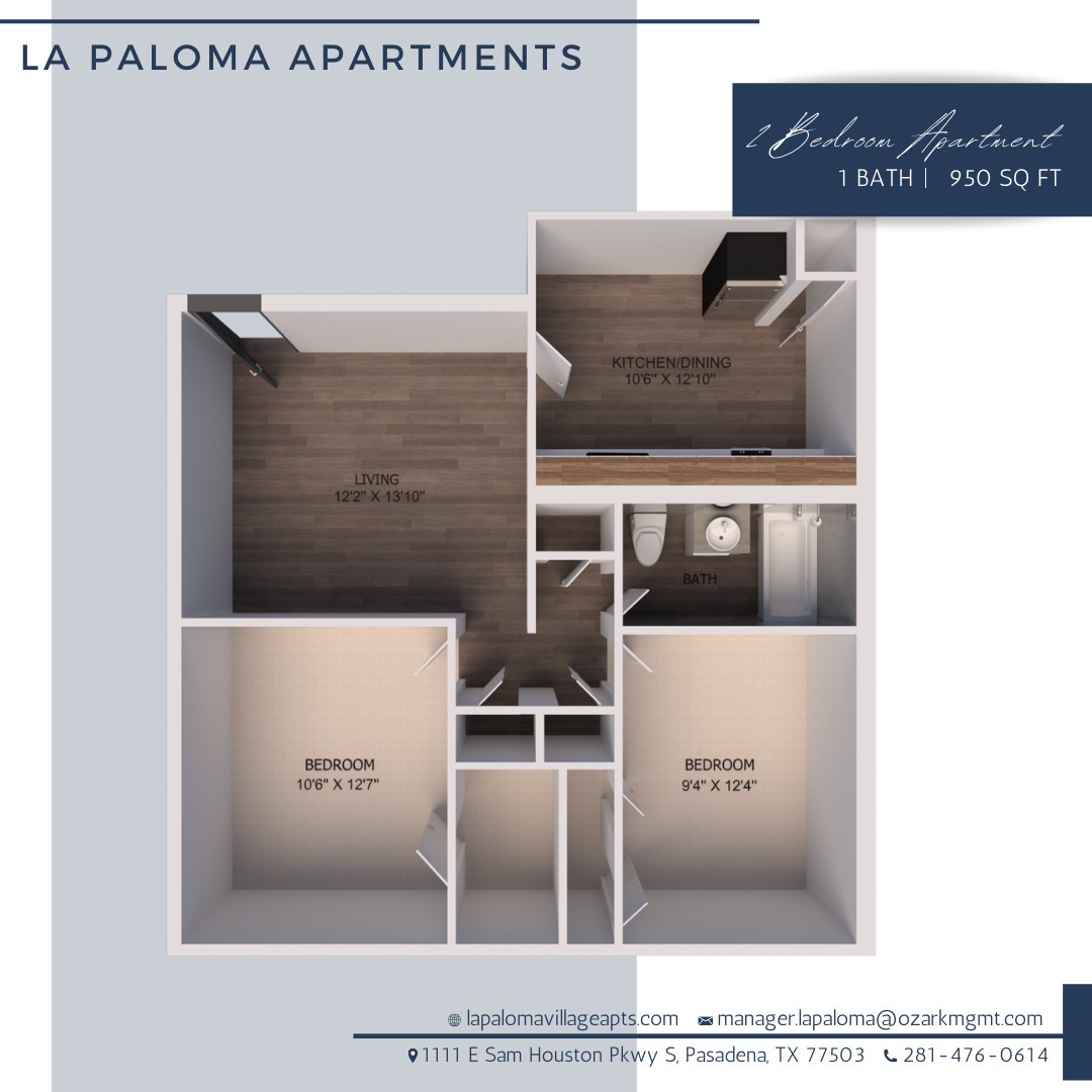 Welcome to La Paloma Village Apartments in Pasadena, TX! Our spacious 2-bedroom, 1-bathroom apartments are designed to provide you with a comfortable and convenient living experience. As you step inside, you'll notice the beautiful tile flooring that adds a touch of elegance to your home. The fully applianced kitchen is perfect for those who love to cook, and the ceiling fans in each room will keep you cool during the warmer months. With spacious closets and an entry closet, you'll have plenty of storage space for all your belongings. At La Paloma Village Apartments, we prioritize your comfort and convenience, offering you a cozy and functional living space. Come and experience the best of apartment living at La Paloma Village Apartments!